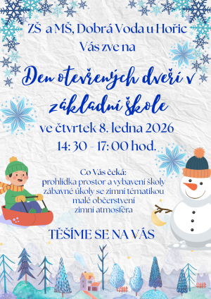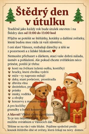 Prosíme o přispění do sbírky pro opuštěné čtyřnohé kamarády, kteří našli svůj domov v útulku manželů Musilových v Chlumu u Hořic. Sbírka probíhá ve spolupráci obce Dobrá Voda u Hořic a naší školy. Přispět můžete do 19.12.2025. Děkujeme vám za spolupráci.